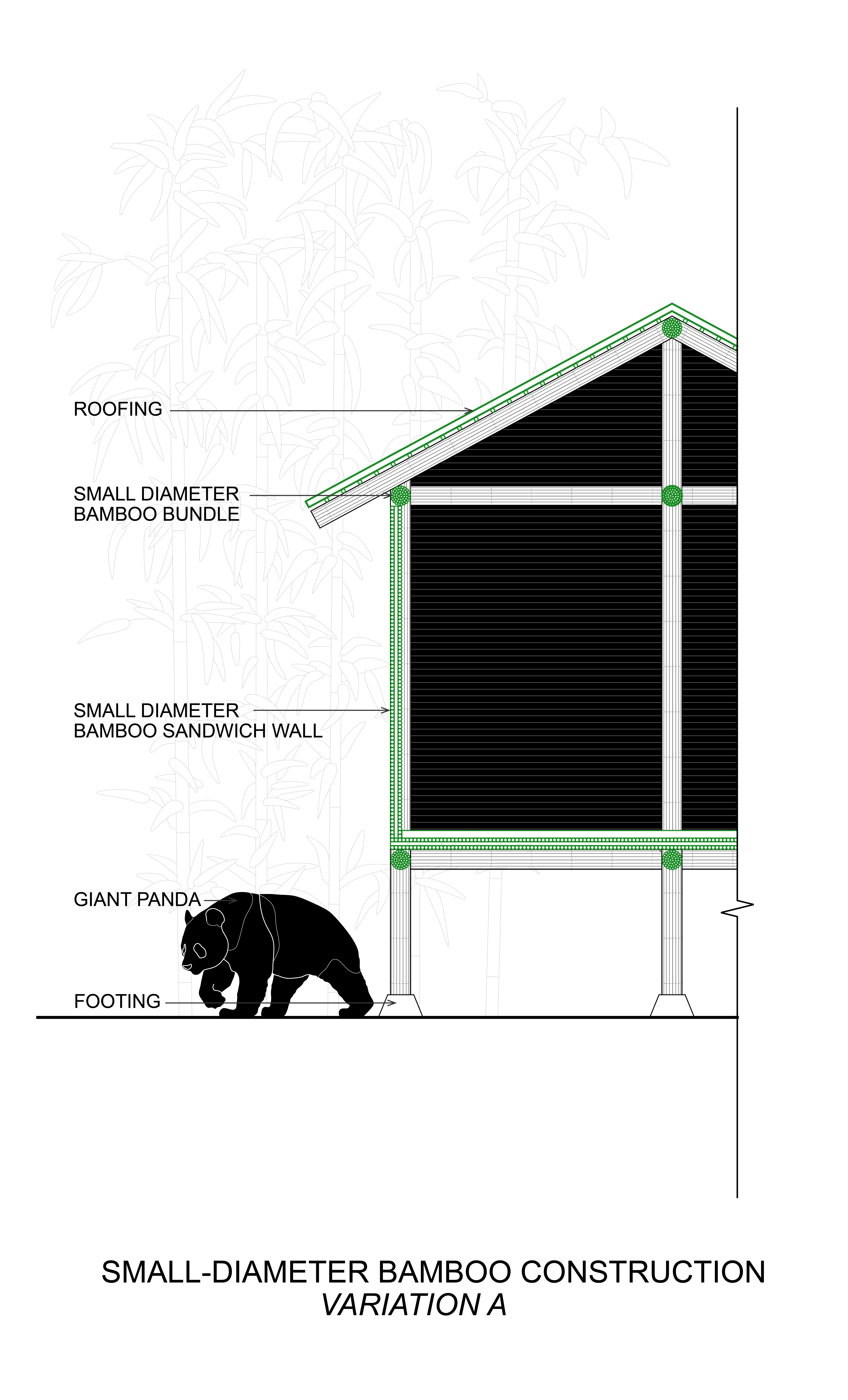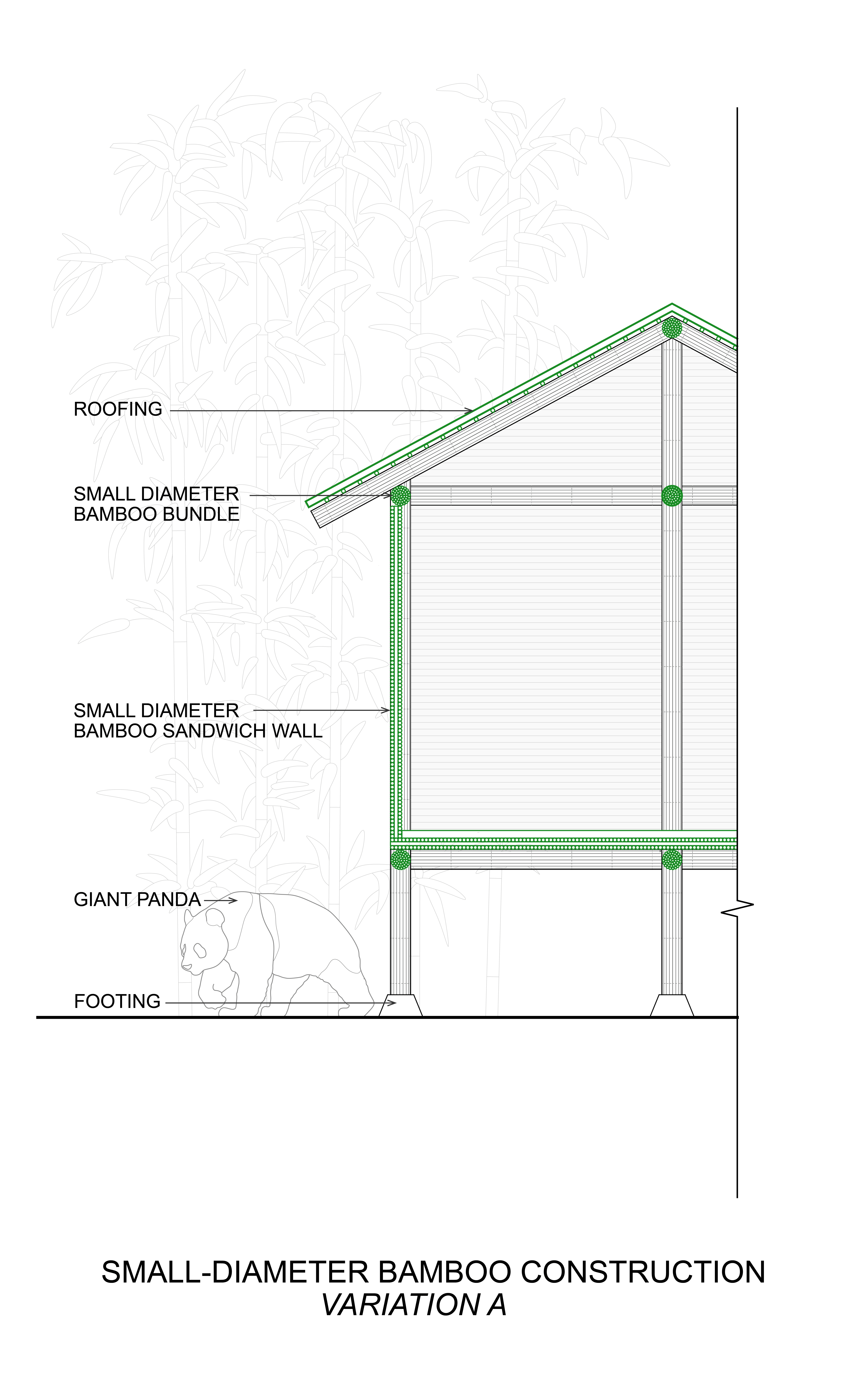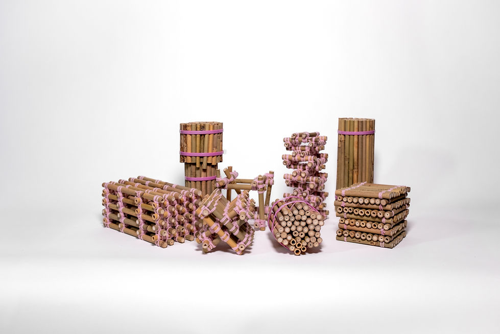 Our goal is to explore small diameter bamboo as an alternative to large diameter bamboo. In conventional construction, bamboo viewed as linear with materials as infill. Small diameter bamboo, however, offers greater flexibility in shaping structures. It can be seen as a modular unit, like bricks, or as a surface similar to CLT. To maintain load capacity columns may need thicker bundles and can be staggered or splayed.
